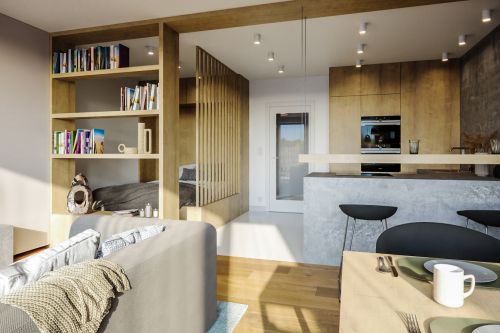 Jedná se o apartmán s ložnicí, v jehož obytném prostoru je specificky řešený kout pro spaní i relaxaci oddělený laťkovou stěnou.
