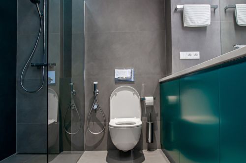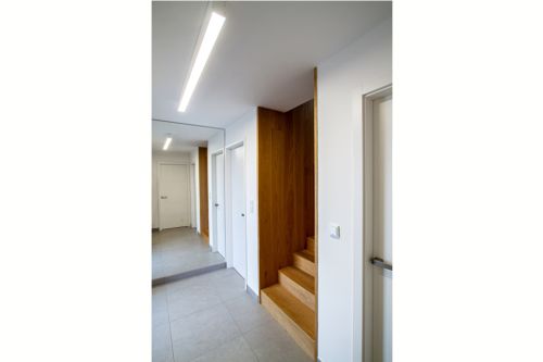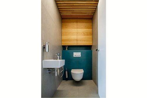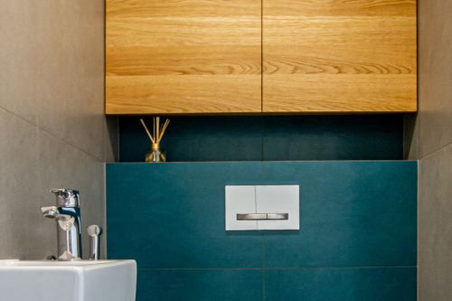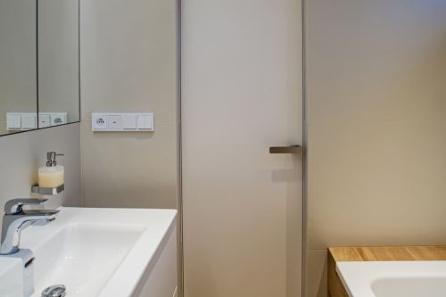 Hlavní koupelna plní funkci i prádelny a je pojatá trochu hravěji. Vestavěný nábytek, který v sobě skrývá pračku a sušičku je opatřen zelenými dvířky. Tato barva je pak reflektovaná i na opačné straně ve sprchovém koutě. Osvětlení koupelny je řešeno LED pásky, které jsou integrované do nik v sádrokartonových podhledech. Vyvářejí iluzi nekončícího stropu.