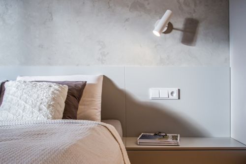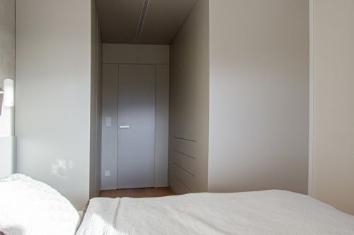 Ostatní místnosti si už žijí tak trochu vlastní život. Ložnice je tvořena nábytkovou vestavbou šatny, postelí s čelem a nočními stolky na míru. Stěna za postelí je opatřena stěrkou v totožné barvě jako nábytek. Na ložnici navazuje miniaturní koupelna s vanou. Její stěny jsou obloženy bílobéžovým velkoformátovým obkladem.