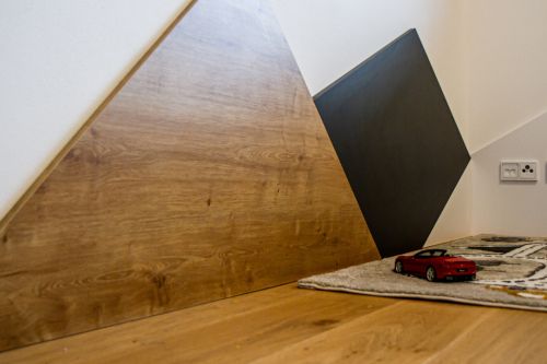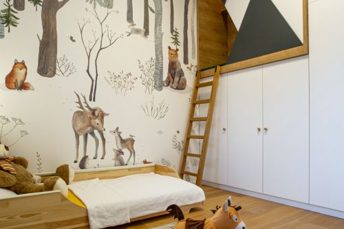 V dětském pokoji byla vytvořena nábytková vestavba s malým úkrytem, který mohl vzniknout díky vyššímu stropu . Celý pokojíček je laděn do přírodních odstínů s motivem hor, ať už na obkladu stěn, tapetě na stěně nebo na vestavěném nábytku.