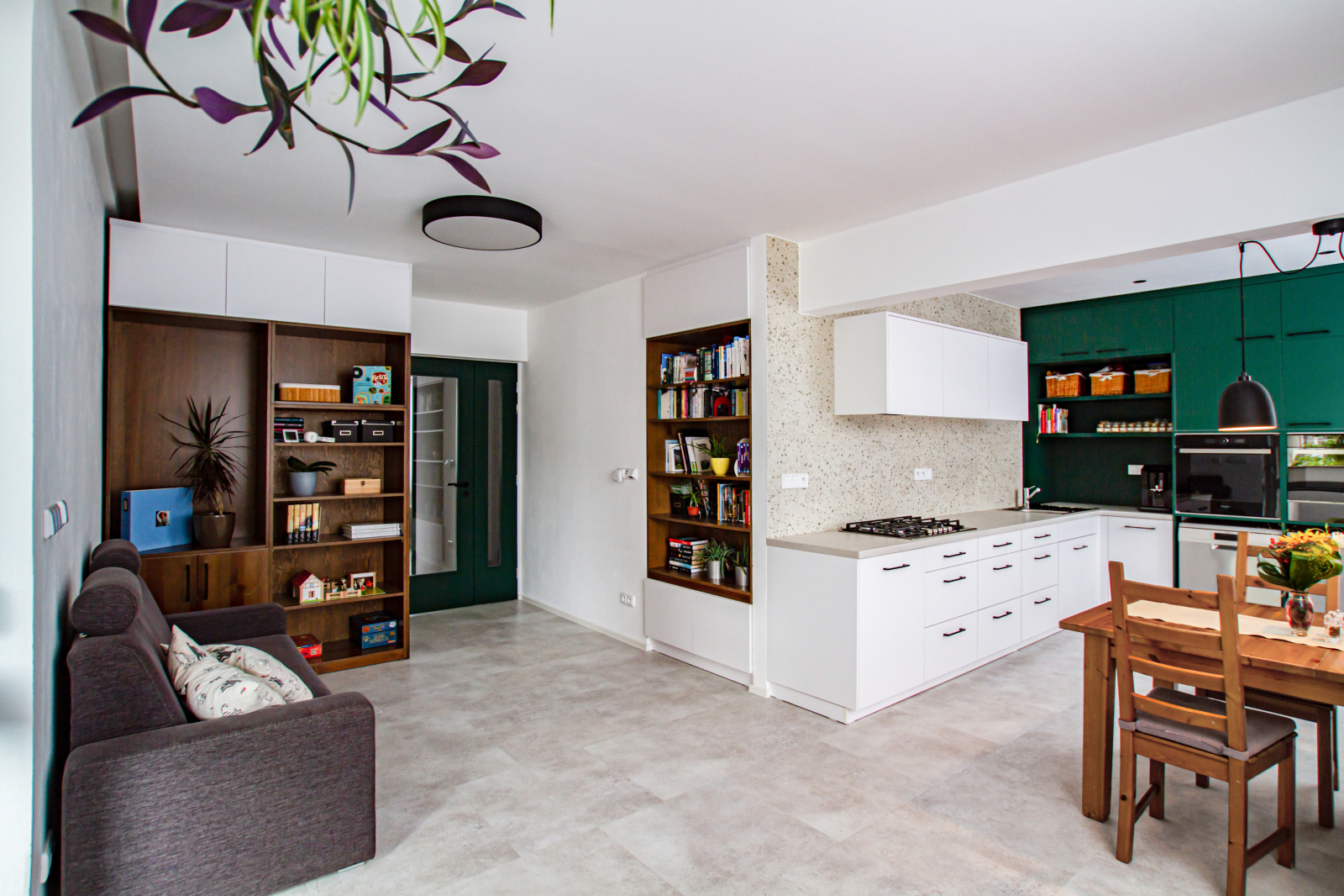 Důležitým prostorem se stalo zádveří, které je nositelem obřího množství úložných prostor. Celou dlouhou chodbu lemuje vestavěná skříň, která má v určitém prostoru skoro metrovou hloubku. Tato skříň takřka supluje komoru a ulevuje ostatním místnostem. Chodba je centrálním prostorem pro vstup do všech místností a její stěny jsou děleny výraznými zelenými dveřmi v ocelové zárubni. Ocelové zárubně jsou odkazem na historii samotného bytu, kde tyto zárubně byly taktéž použity. Zvolili jsme jen modernější, hranatější typ zárubně. Největšími prosklenými dveřmi se vstupuje do obývacího pokoje s kuchyní půdorysného tvaru L. Protože majitelé nevlastní televizi a ani příliš nevyužívají gaučové posezení, je hodně velká plocha věnována kuchyni, a také hernímu koutku pro kluky. Ten se může časem proměnit třeba i na pracovní koutek nebo relaxační zónu. Místo se přizpůsobí koloběhu rodiny. Kuchyně tvaru L má v zadní části vysokou zelenou hmotu, která skrývá všechny spotřebiče, i ty přivezené z původního bytu. Na vysoké moduly navazuje pracovní deska s velkým plynovým sporákem a dřezem.