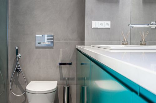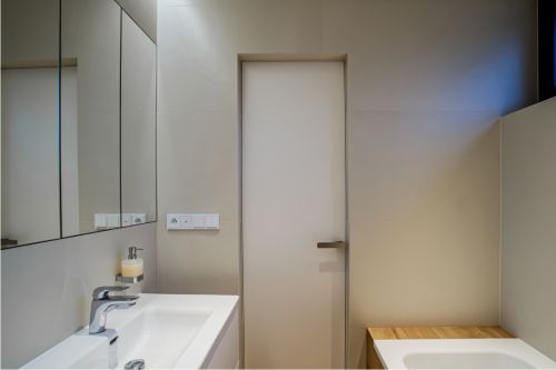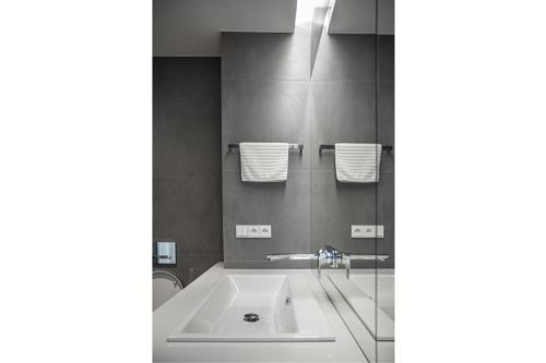 Hlavní koupelna plní funkci i prádelny a je pojatá trochu hravěji. Vestavěný nábytek, který v sobě skrývá pračku a sušičku je opatřen zelenými dvířky. Tato barva je pak reflektovaná i na opačné straně ve sprchovém koutě. Osvětlení koupelny je řešeno LED pásky, které jsou integrované do nik v sádrokartonových podhledech. Vyvářejí iluzi nekončícího stropu.