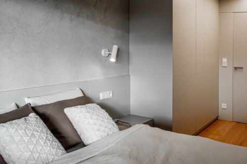Ostatní místnosti si už žijí tak trochu vlastní život. Ložnice je tvořena nábytkovou vestavbou šatny, postelí s čelem a nočními stolky na míru. Stěna za postelí je opatřena stěrkou v totožné barvě jako nábytek. Na ložnici navazuje miniaturní koupelna s vanou. Její stěny jsou obloženy bílobéžovým velkoformátovým obkladem.