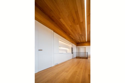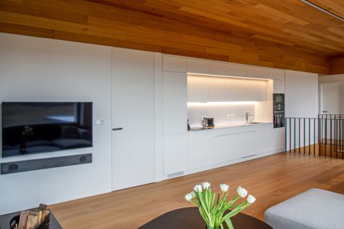 Zásadním prostorem celého domu je obývací pokoj, který propojuje takřka všechny místnosti, je v něm umístěno schodiště, ale zároveň nese hlavní obytnou funkci. Místnost je prosvětlena velkoformátovými okny, která jsou přerušena v prostoru s jídelním stolem. Prostor je horizontálně členěn na podlahovou část až k parapetům, okenní část a strop, který je obložen dřevem, aby vyniklo sešikmení a zvýraznila se větší světlost prostoru – až 3,4 m. Kuchyňská linka je vizuálně součástí stěny. Kuchyni člověk míjí záměrně takřka bez povšimnutí. Naopak k povšimnutí je krbová vestavba s vloženou dřevěnou knihovnou. Ta spolu s pohovkou tvoří útulný, relaxační koutek. Celý prostor oživují tmavě šedé materiály (zábradlí schodiště, betonová stěrka, dlažba před krbem a doplňky). Důležitou roli hraje i osvětlení. Na celou délku obývacího pokoje je roztaženo lineární zapuštěné hlavní světlo, které jako paprsek prolétá celou místností. Podobným efektem je osvětlena i kuchyňská linka.