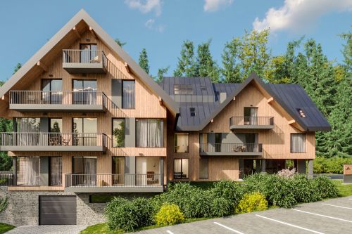 Apartmánový dům byl navržen do horského prostředí. Členitá, ale klasicky tvarovaná stavba se pyšní mohutnými střechami, které jsou pro hory typické. Dům je v nadzemních podlažích obložen červeným cedrem, který dodává fasádám na živosti a zároveň chrání obálku před horskými povětrnostními podmínkami. Dřevěný obklad je prostřídáván nadstandardně rozměrnými okny, které prosvětlují interiéry. Celý dům stojí na kamenném soklu, podzemním patře, který dům propojuje s okolní zahradou a vyrovnává mírně svažitý terén. Dům získal industriální šmrnc použitím kovových tmavě šedých zábradlí a oplechování.